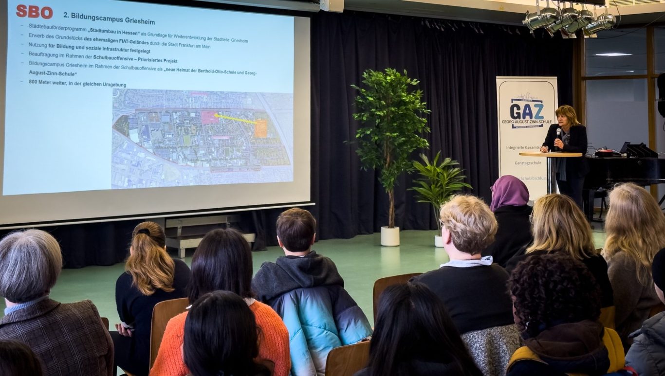 Ein weiterer inhaltlicher Höhepunkt des Tages war der Vortrag zur Zukunft der Georg-August-Zinn-Schule, der auf entsprechend großes Interesse stieß. In der gut besuchten Veranstaltung informierte die Schulleitung gemeinsam mit einer Vertreterinnen der Stadt über die nächsten Entwicklungsschritte der Schule. Frau Schmidt von Raumer, kommissarische Leiterin der Stabsstellenleitung und damit zuständig für die Schulbauoffensive der Stadt Frankfurt, ging in ihrem Beitrag insbesondere auf die Planungen zum Neubau des Schulcampus am Fiatgelände an der Mainzer Landstraße sowie auf die Einrichtung einer gymnasialen Oberstufeein, die ab dem Jahr 2029 ihren Betrieb aufnehmen soll. Die Ausführungen stießen bei den anwesenden Eltern auf eine sehr positive Resonanz und regten zahlreiche weiterführende Gespräche an.