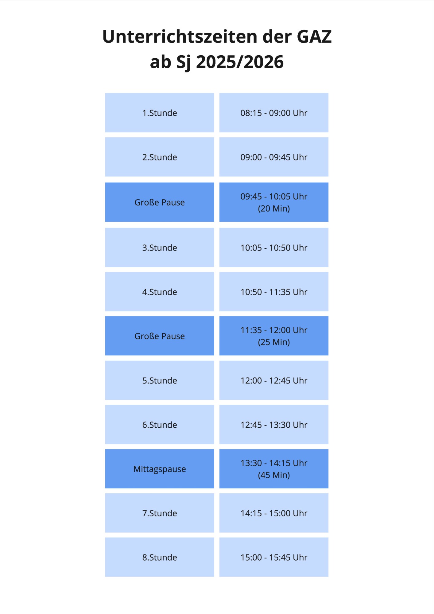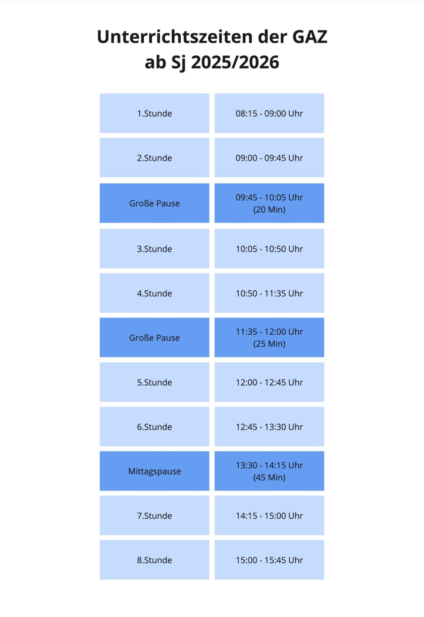 - Die GAZ ist eine Ganztagsschule im Profil 2. Wir bieten damit eine Ganztagsbetreuung bis 16 Uhr durch unser Ganztagsangebot "TuWas" an.